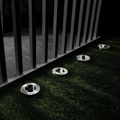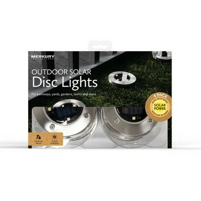 Ambient lighting for your outdoor space with these Outdoor Solar Disc Lights from Merkury Innovations. The warm white LED glow creates a cozy and welcome environment, perfect for pathways, yards, gardens, lawns and more. Charges from sunlight – no outlet or electricity required. Automatically powers on at dusk and off at dawn. Easy to mount with the included stakes.