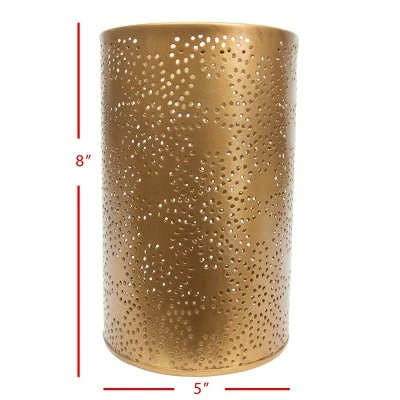 Stunning when lit up, this cylindrical pillar candle holder has an antiqued bronze finish. Pierced with a delicate floral pattern that creates a luminary effect with a lit or flameless candle inside. The warm tones of the antiqued bronze finish make this the perfect boho accent to lighten up your space.