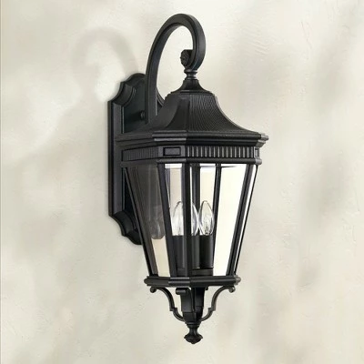 Three timeless candelabra bulbs glow behind delicate panels of beveled glass in this handsome black finish outdoor wall light. With a classic scrolled design and intricately detailed frame, it’s an elegant way to illuminate a traditional style garage, entryway or porch. From the Cotswold Lane collection by Feiss.