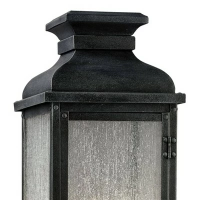Storied nautical fare casts a spell of intrigue and old-time charm, turning this three-light outdoor post light lantern into a tasteful way to accentuate home and business structures. This traditional style post light is from the Pediment collection by Feiss offers an aged flavor with a dark aged zinc finish over stainless steel construction in a lantern style with ornate silhouetting. Textured glass panels offer a partial view of a candelabra style bulb base (bulbs not included).