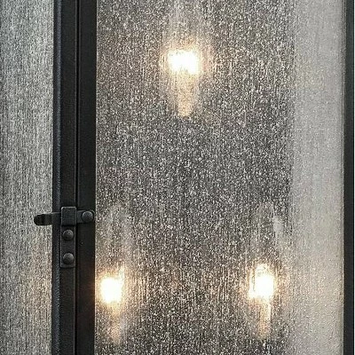 Storied nautical fare casts a spell of intrigue and old-time charm, turning this three-light outdoor wall light into a tasteful way to accentuate home and business structures. This elongated wall light from the Pediment collection by Feiss offers an aged flavor with a dark weathered zinc finish over stainless steel construction in a lantern style with ornate silhouetting. Textured glass panels offer a partial view of a candelabra style bulb base (bulbs not included).