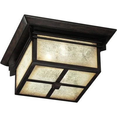 Inspired by traditional Mission Arts and Crafts styles, this flushmount ceiling light is a beautiful addition to an indoor or outdoor space. This classic design consists of a straight-lined frame with a lovely architectural look. A walnut bronze finish adds a handsome touch, while textured frosted cream glass panels provide a warm and welcoming glow.