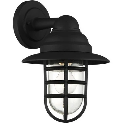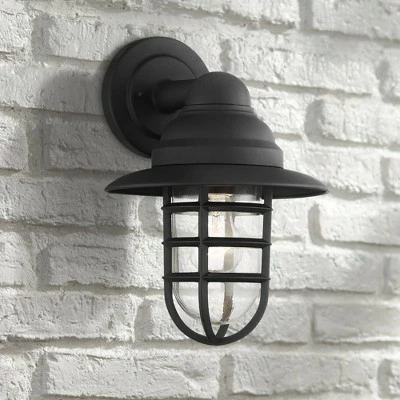 The Marlowe collection of outdoor lighting offers a creative combination of nautical style and industrial design. This metal outdoor wall light features a stylish cage design with a hood on top and a narrow clear glass shade inside. A matte black finish completes the hardy, rustic look. Perfect for lighting up a patio area or garage space.