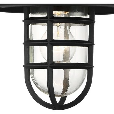 - Black metal finish cage frame with hood. Clear glass shade inside.