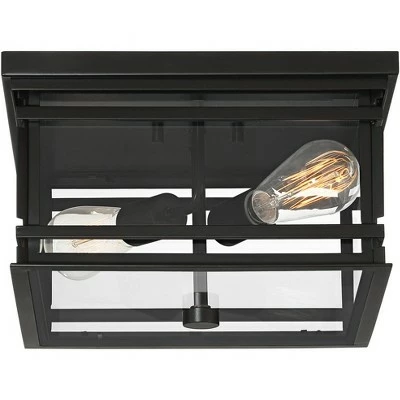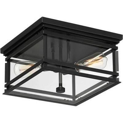 Brighten up an outside space with this lighting fixture from the North House collection by John Timberland. A handsome lighting solution for a porch or patio, this flushmount outdoor ceiling light comes in a steel frame with the elegant silhouette of classic Mission style lighting. A matte black finish is the perfect complement to this design. The clear glass panels gives a full view of the bulbs used within, making decorative light bulbs an excellent choice for this fixture.