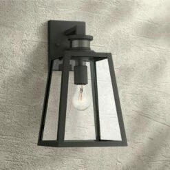 Brighten up your home’s exterior with this handsome outdoor wall light from the Arrington collection by John Timberland. This updated industrial design comes in a tapering black frame with a sleek, straight-lined look. Clear glass panels offer a full view of its beautiful vintage Edison style bulb. Use the motion sensor functionality with a dual brightness feature for security and efficient lighting. Dual-bright design means the light turns on at 25% brightness and goes to 100% when motion is detected. Two minutes after motion is no longer detected, the light will revert to low-level brightness.
