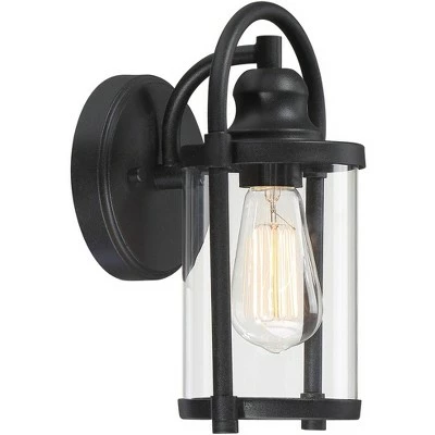 A cylindrical shade enhanced by black finish framing is the main focus of this set of two outdoor wall lights. One visible bulb housed within each provides ambient lighting. The curves and lines in the framing provide an intriguing geometric element. Easily upgrade your curb appeal by adding these lights to a garage or entryway.