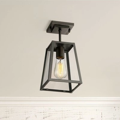 Brighten up your home’s exterior with this semi-flushmount ceiling light from the Arrington collection by John Timberland. This updated industrial design comes in a tapering black frame with a sleek, straight-lined look. Clear glass panels offer a full view of the beautiful vintage Edison style bulb that is included with purchase. Rated for use in damp locations such as covered porches and patios.