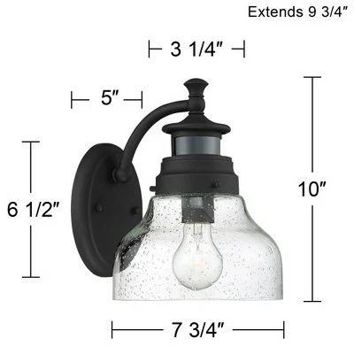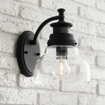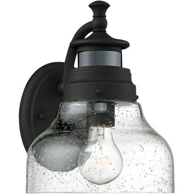 This classy outdoor wall light is perfect for contemporary or transitional settings. It comes in a black finish steel frame and has a clear seedy glass shade with an open bottom. This fixture also comes with a built-in motion sensor feature that turns on when it detects movement, adding an extra sense of security to your home. Also includes a dusk-to-dawn feature. Dual-bright design means the light turns on at 25% brightness and goes to 100% when motion is detected. Two minutes after motion is no longer detected, the light will revert to low-level brightness.