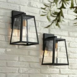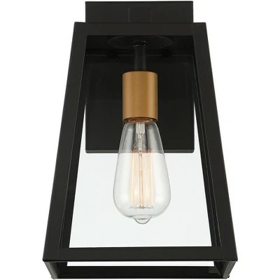 Brighten up your home’s exterior with this handsome outdoor wall light set from the Arrington collection by John Timberland. This updated industrial design comes in a tapering black frame with gold finish accents. Clear glass panels offer a full view of the beautiful vintage Edison style bulb that is included with purchase. Wet location outdoor rated. Vertical installation and wall mount only.