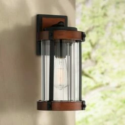 Vertical ribs in a clear glass shade add texture and eye-catching intrigue to this outdoor wall light from John Timberland®. This impressive wall light is perfect for a grand outdoor kitchen or living area as it shows off a dark wood finish frame and distinctive black finish aluminum accents. This wall light is a single-light fixture that delivers a welcoming glow to your outdoor space.