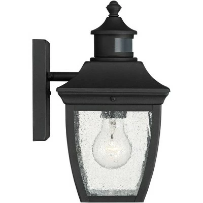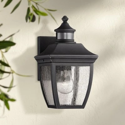 This outdoor wall light offers a charming, old-fashioned style for your home. It comes in a black finish frame that curves lightly in the middle for a shapely look. Seedy glass panels add a moody rain-washed effect. For extra security, lighting fixture includes a built-in dusk-to-dawn motion sensor feature. Dual-bright design means the light turns on at 25% brightness and goes to 100% when motion is detected. Two minutes after motion is no longer detected, the light will revert to low-level brightness.