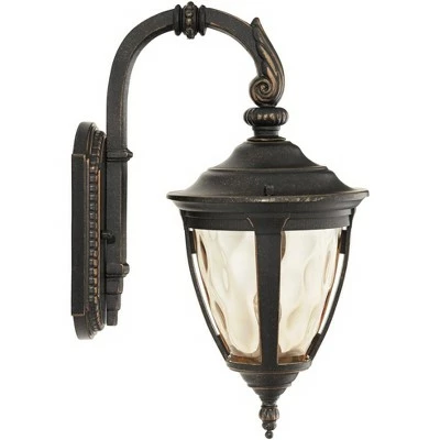 From the Bellagio outdoor lighting collection by John Timberland, this traditional design will add timeless appeal to any home. This outdoor wall light fixture features a handsome, antique-style backplate and downbridge top arm. The combination of champagne hammered glass panels with a bronze finish creates a charmingly vintage look.