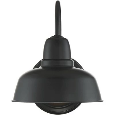 From the Urban Barn collection by John Timberland, this indoor-outdoor wall light comes in a charming industrial farmhouse style. The steel frame features a wide downlight shade attached to the end of a thin, arching gooseneck arm. A smooth black finish adds a classy and refined touch. Perfect for use in a porch or patio area.