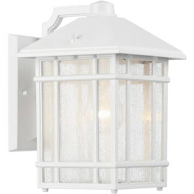 Add Americana styling from Kathy Ireland’s Sierra Craftsman collection to your home. This outdoor wall light design was inspired by classic Arts and Crafts looks from the turn of the century. It features a white finish with frosted seeded glass. With its clean lines and striking look, this is perfect for adding curb appeal to your home.