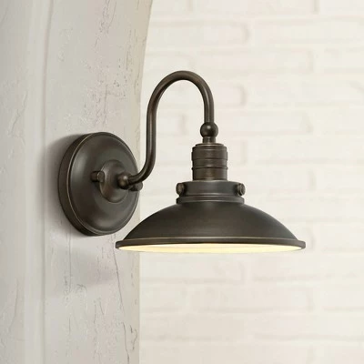 - Traditional industrial and farmhouse barn-light inspired design. Gooseneck top arm. Oil rubbed bronze with gold finish highlights. Metal construction. Rain glass diffuser lens.