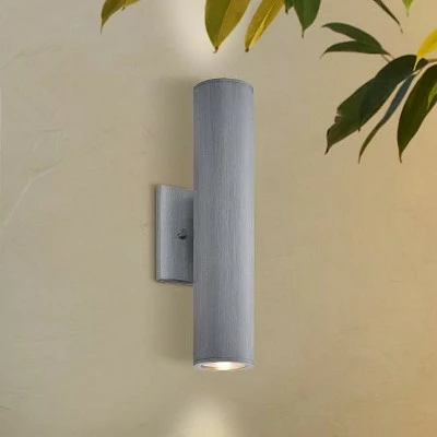This large modern outdoor LED up and down light is a sleek and simple metal cylinder attached to a rectangular back plate. Smooth brushed aluminum finish softens the look of this chic, sophisticated outdoor wall light. A beautiful addition to your home from Minka lighting.
