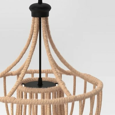 - Boho-inspired chandelier shape with jute wrap and dangling accents