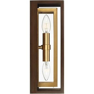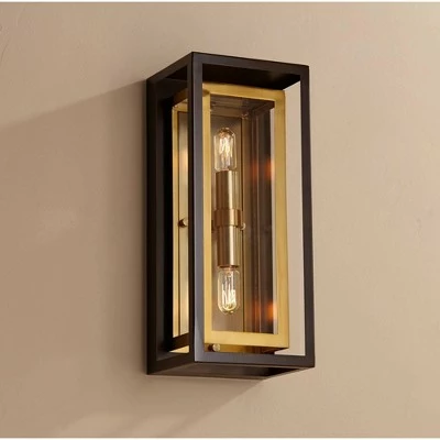 Update the look of a home exterior with this contemporary outdoor wall light. A double box design features an outer oil rubbed bronze finish frame over a brass inner frame with glass panels. The open look adds a freeform feel and keeps the design fresh and timeless.